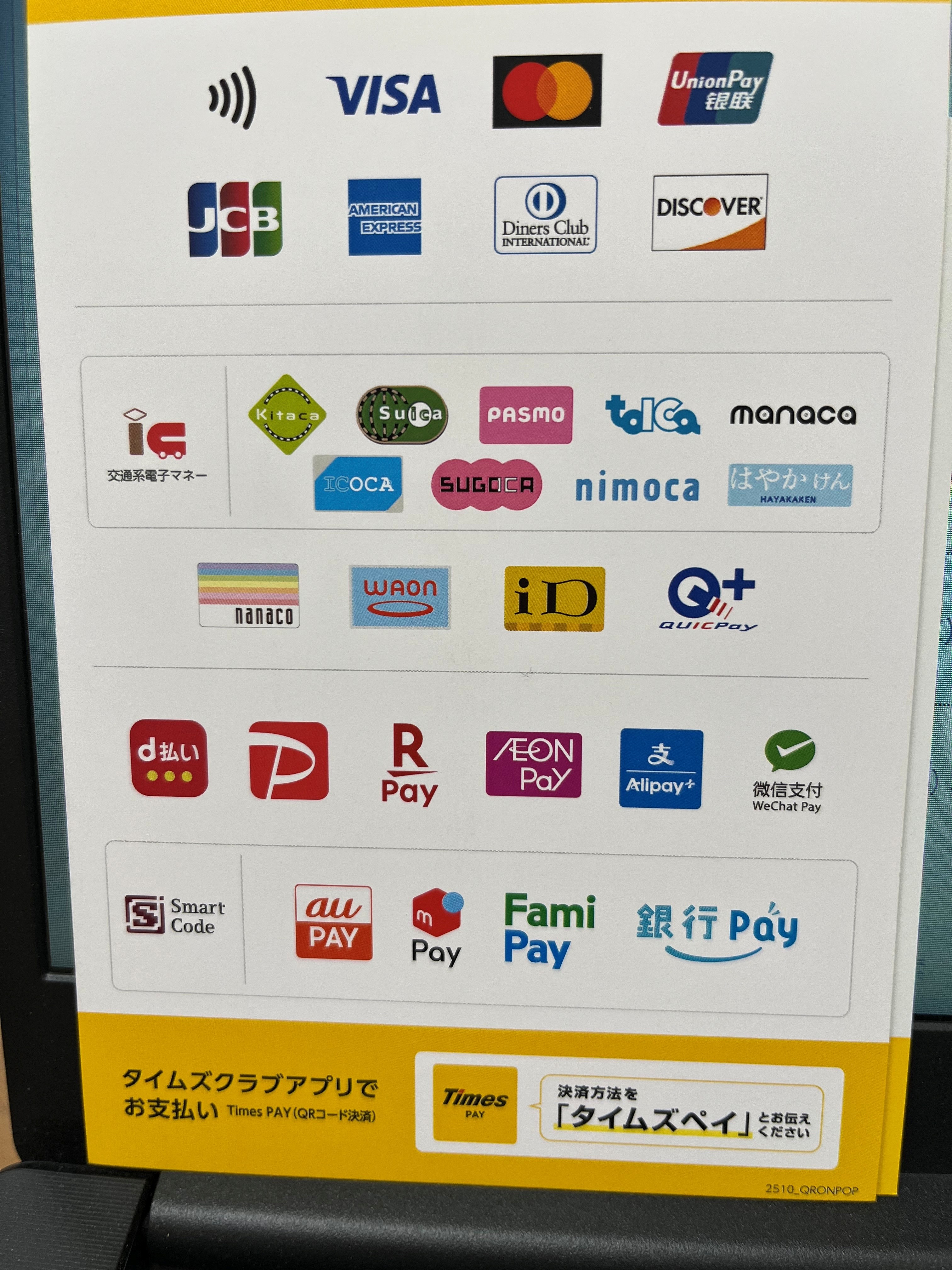これにより、クレジットカード決済と電子マネー決済は可能、そして、今週より一部のQRコード決済が可能になりました。
